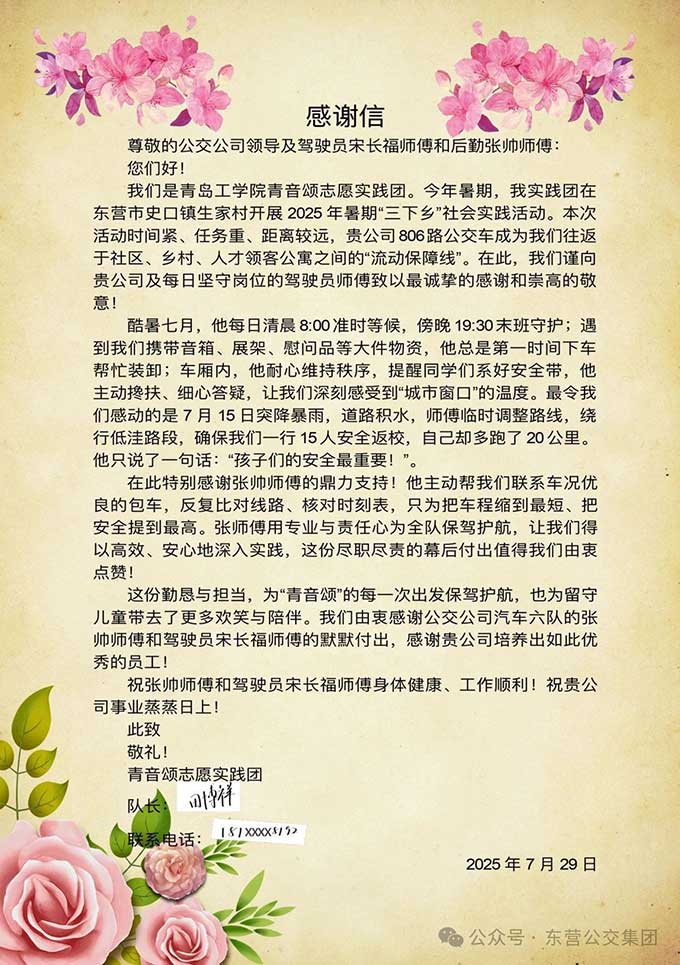 近日,青島工學(xué)院青音頌志愿團(tuán)發(fā)來一封感謝信,感謝東營(yíng)市公交集團(tuán)駕駛員宋長(zhǎng)福師傅熱情服務(wù)。原來,在今年...